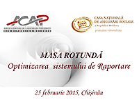 25 februarie 2015,  ora 14:00, Chişinău,  Asociaţia Contabililor şi Auditorilor Profesionişti din Republica Moldova (ACAP) a organizat  în incinta Centrului de conferințe “SUMMIT”, Masa Rotundă cu genericul: „Optimizarea sistemului de Raportare”. Premisele acestui eveniment au devenit unele modificări introduse în Proiectul Legii bugetului asigurărilor sociale de stat pentru 2015, care țin de prezentarea lunară a Declaraţiei  (forma BASS), Declaraţiei persoanei asigurate (REV 5), cît și utilizării în mod obligatoriu instrumentelor de raportare electronica cu aplicarea semnăturii digitale.