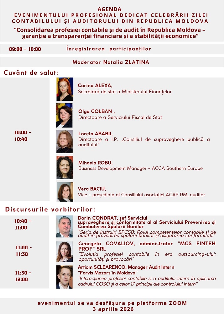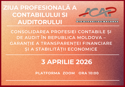 Chișinău, 03 aprilie 2026 ACAP RM a desfășurat, pe platforma ZOOM, conferința profesională dedicată Zilei Contabilului și Auditorului din Republica Moldova, cu genericul „Consolidarea profesiei contabile și de audit în Republica Moldova – garanție a transparenței financiare și a stabilității economice”.