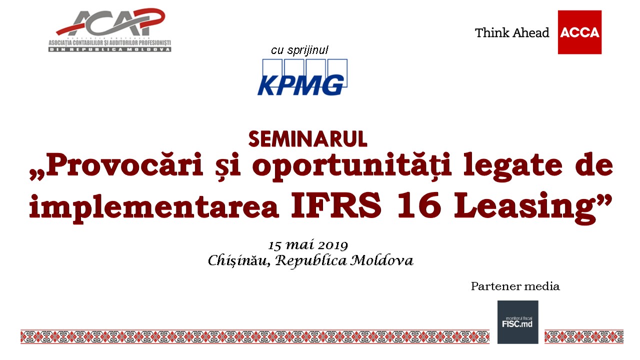 În data de 15 mai 2019, membrii ACAP RM (Asociația Contabililor și Auditorilor Profesioniști din RM) și ACCA (Association of Chartered Certified Accountants) au participat la seminarul de instruire profesională cu genericul ”Provocări și oportunități legate de implementarea IFRS 16 Contracte de leasing”.