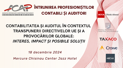 Tradițional pe final de an ACAP RM în parteneriat cu ACCA, cooperare cu Serviciul Prevenirea și Combaterea Spălării Banilor, Taxaco SRL și Crowe Audit FPA a desfășurat un eveniment, care a reunit experți din domeniul contabilității și auditului, precum și reprezentanți ai instituțiilor publice, creând un cadru propice pentru schimbul de idei și bune practici. Genericul evenimentului desfășurat în incinta ”Mercure Chisinau Center Jazz Hotel”, sala Saxophone și online pe platforma ZOOM a fost Contabilitatea și Auditul în contextul transpunerii Directivelor UE și a provocărilor globale: interes, impact și posibile soluții.
