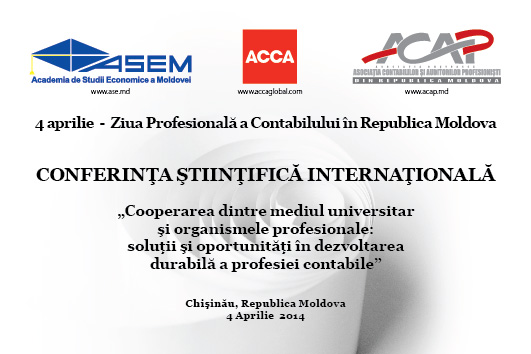 04 Aprilie 2014, ora 09:00, Chişinău, Hotelul Leogrand, Sala Begonia - Asociaţia Contabililor şi Auditorilor Profesionişti din Republica Moldova (ACAP) şi Catedrele “Contabilitate şi audit” şi “Contabilitate şi analiză economică”ale Academiei de Studii Economice a Moldovei (ASEM) în parteneriat cu Association of Chartered Certified Accountants (ACCA)au organizat Conferinţa Ştiinţifică Internaţională cu genericul: „Cooperarea dintre mediul universitar şi organismele profesionale: soluţii şi oportunităţi în dezvoltarea durabilă a profesiei contabile”.