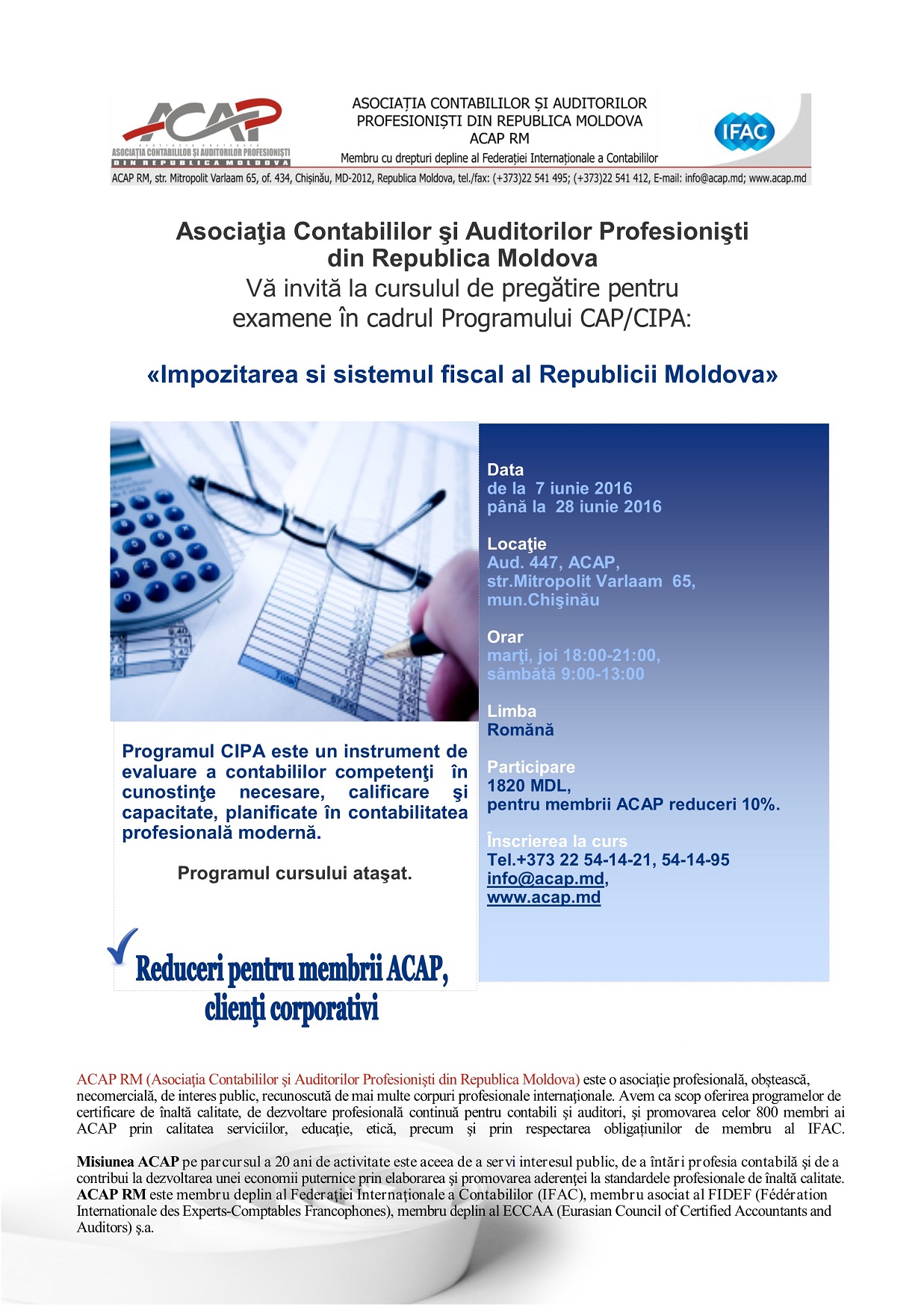 7 iunie 2016 ACAP Vă invită la cursul Impozitarea si sistemul fiscal al Republicii Moldova în cadrul Programului de certificare CAP/CIPA