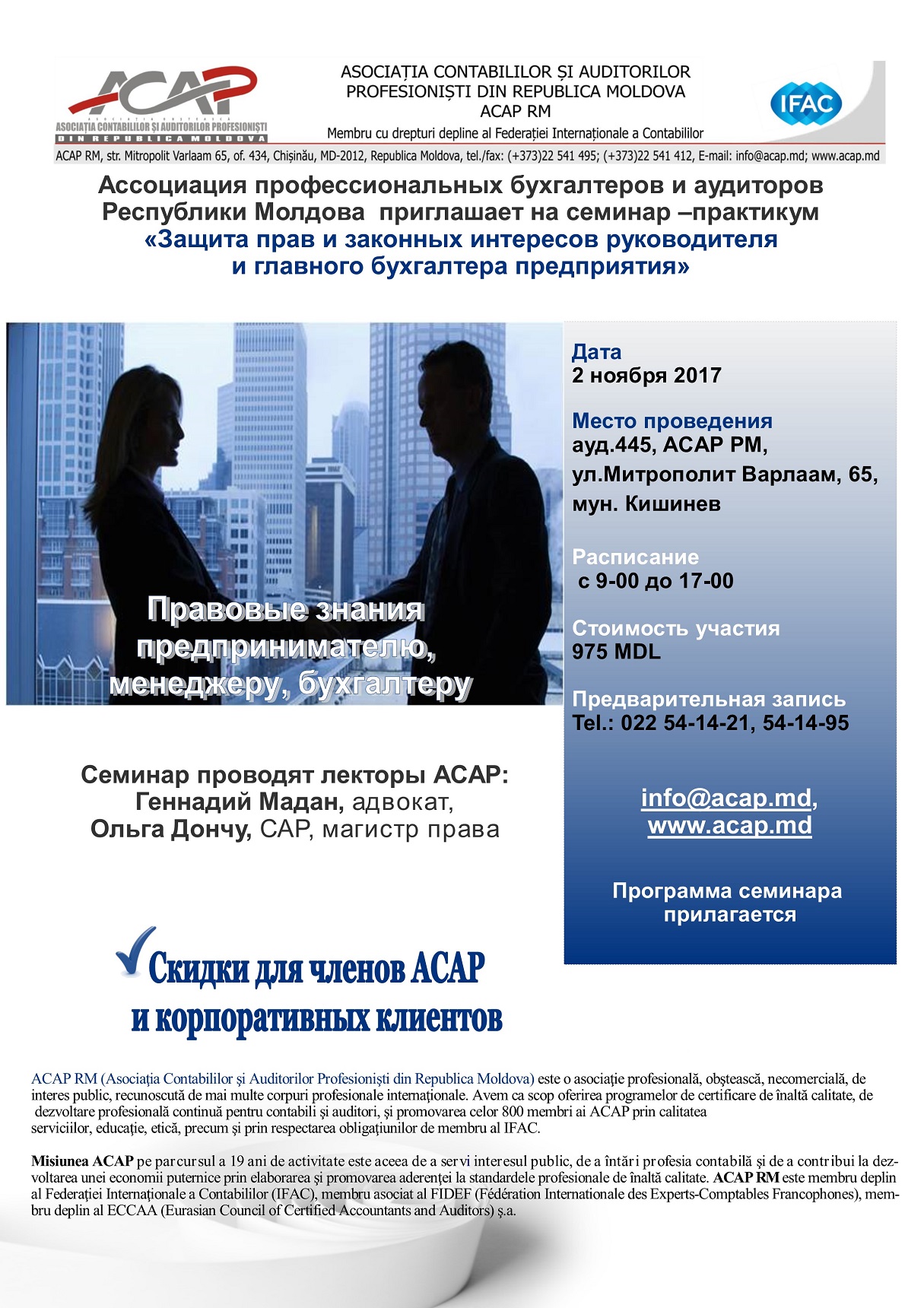 ACAP Va invita la data de 2 noiembrie 2017 la seminar cu genericul: Apărarea a drepturilor și intereselor legitime ale subiecților activității de întreprinzător