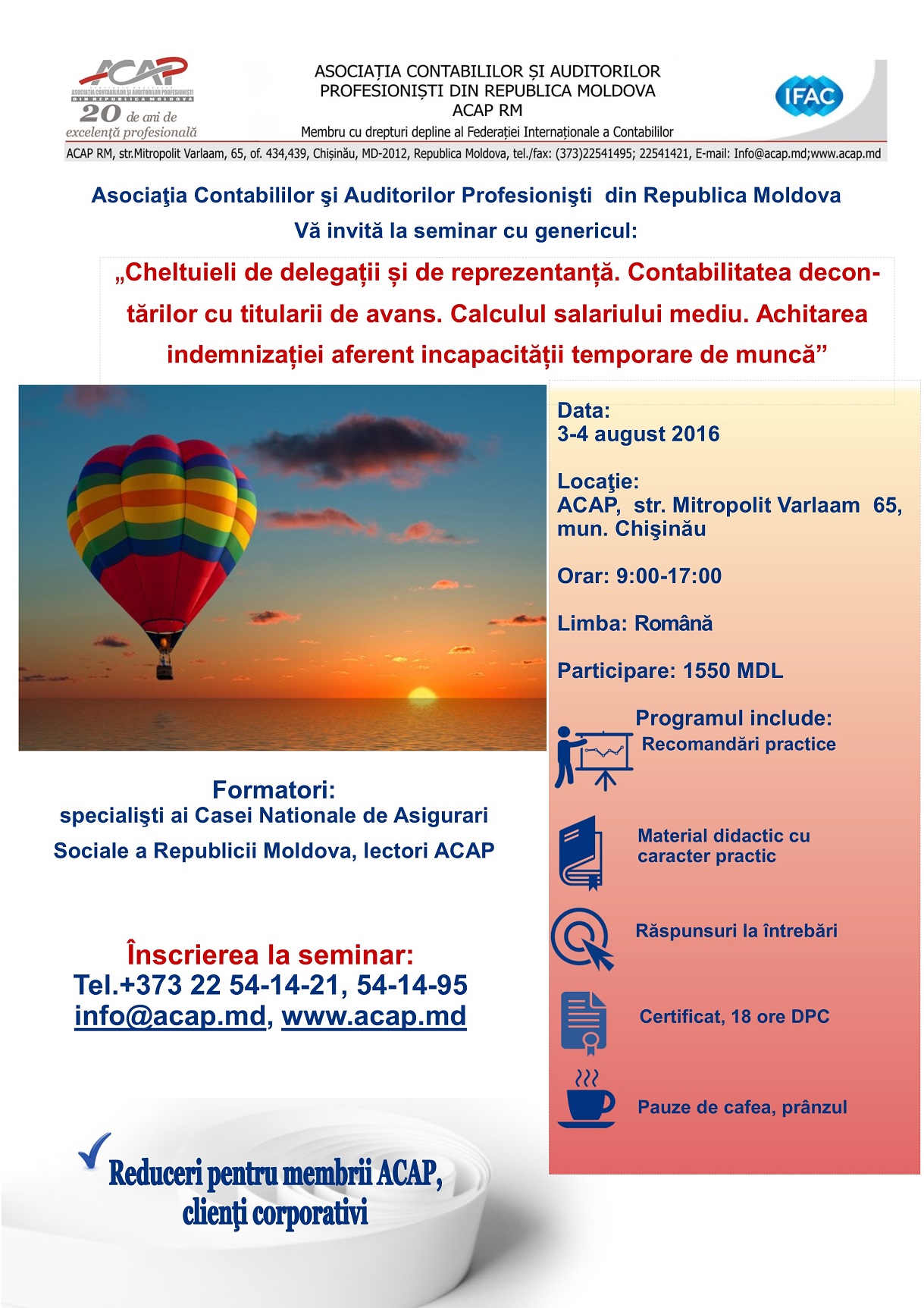ACAP Vă invită la data de 3-4 august 2016 la seminar- practicum cu genericul: Cheltuieli de delegații și de reprezentanţă. Contabilitatea decontărilor cu titularii de avans. Calculul salariului mediu. Achitarea indemnizaţiei aferent incapacităţii temporar