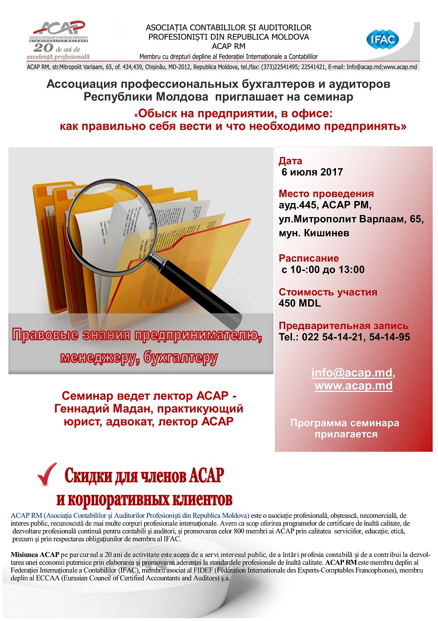 ACAP Va invita la data de 6 iulie 2017 la seminar cu genericul: Perchezitie la întreprindere, la birou; reguli de comportamente