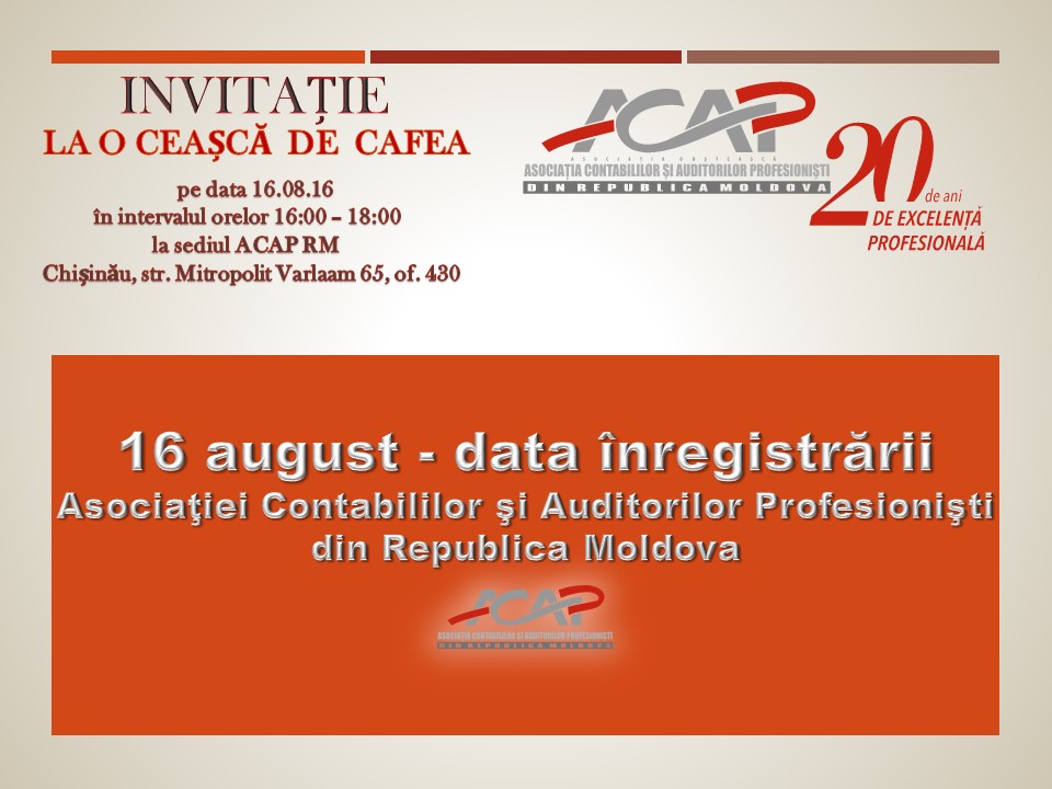 ACAP Va Invita LA O CEASCA DE CAFEA pe data de 16 august la sediul ACAP, of.430, ora 16:00-18:00 cu ocazia ZILEI ACAP RM!!!!