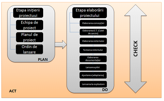 Pentru ca sistemul informaţional sau serviciul electronic dezvoltat să aibă un nivel înalt de calitate, etapele de implementare se desfăşoară în strictă conformitate cu ciclul „Planifică-Efectuiază-Verifică-Acţionează” (fig. 1). Această abordare, bazată pe proces, presupune un control permanent, la fiecare nivel de realizare al acestuia. Astfel, pentru început se elaborează un plan tactic de implementare a proiectului care înglobează toate acele etape necesare.