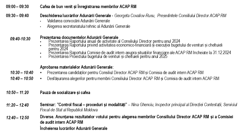 Ordinea de zi a Adunării Generale ACAP RM este următoare: