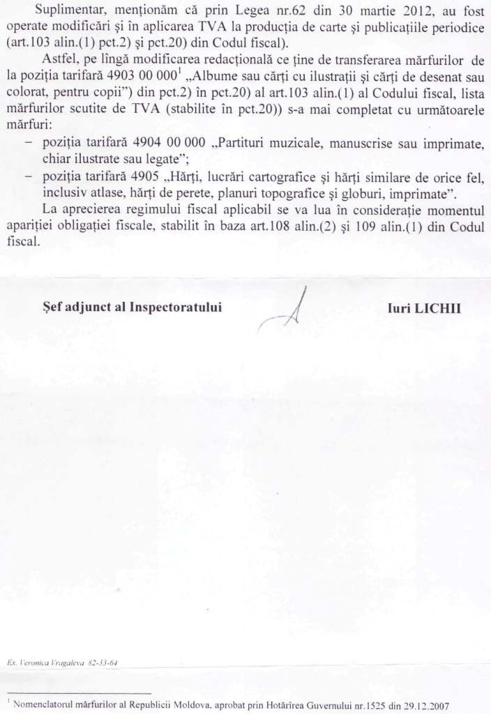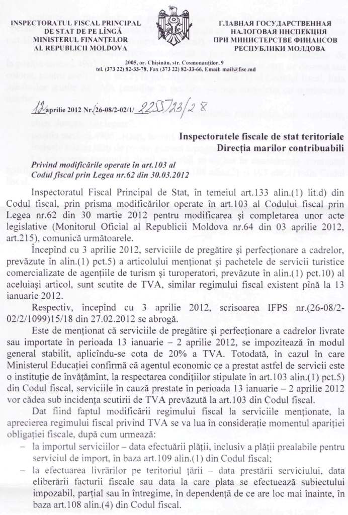La adresările nr.069 din 07.03.2012 şi nr. 075 din 19.03.2012 din partea Asociaţiei Contabililor şi Auditorilor Profesionişti din Republica Moldova (ACAP RM), privind aplicarea TVA la prestarea serviciilor de pregătirea şi perfecţionarea cadrelor, Inspectoratul Fiscal Principal de Stat a comunicat următoarele.