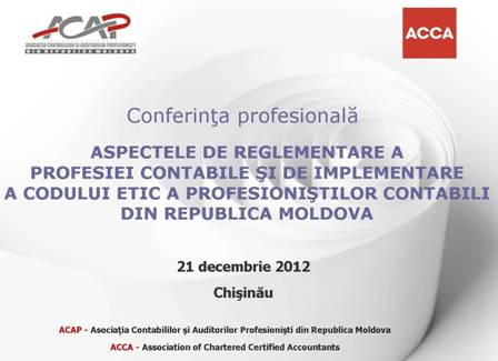 Asociaţia Contabililor şi Auditorilor Profesionişti din Republica Moldova (ACAP RM) în parteneriat cu ACCA (Association of Chartered Certified Accountants) a organizat la data de 21 decembrie 2012 Conferinţa profesională „Aspecte de reglementare a profesiei contabile şi de implementare a Codului Etic a Profesioniştilor Contabili din Republica Moldova” cu sprijinul companiilor KPMG, PwC şi Soter&Partners.