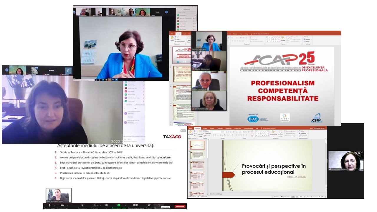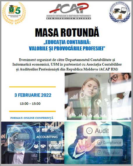 În data de 3 februarie 2022, Asociația Obștească “Asociația Contabililor și Auditorilor Profesioniști din Republica Moldova” ACAP RM și Departamentul Contabilitate si Informatică Economică, USM, au desfășurat evenimentul profesional, în format online, discuțiile fiind axate pe formarea și instruirea viitorului contabil, precum și aspecte privind noua educație contabilă universitară.