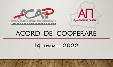 Cu scopul întăririi bunelor relații de cooperare și a dezvoltării profesiei de audit și contabile Asociaţia Contabililor şi Auditorilor Profesionişti din Republica Moldova (ACAP RM) și Camera Auditorilor din Republica Belarus au semnat un Acord de Cooperare în data de 14 februarie 2022.