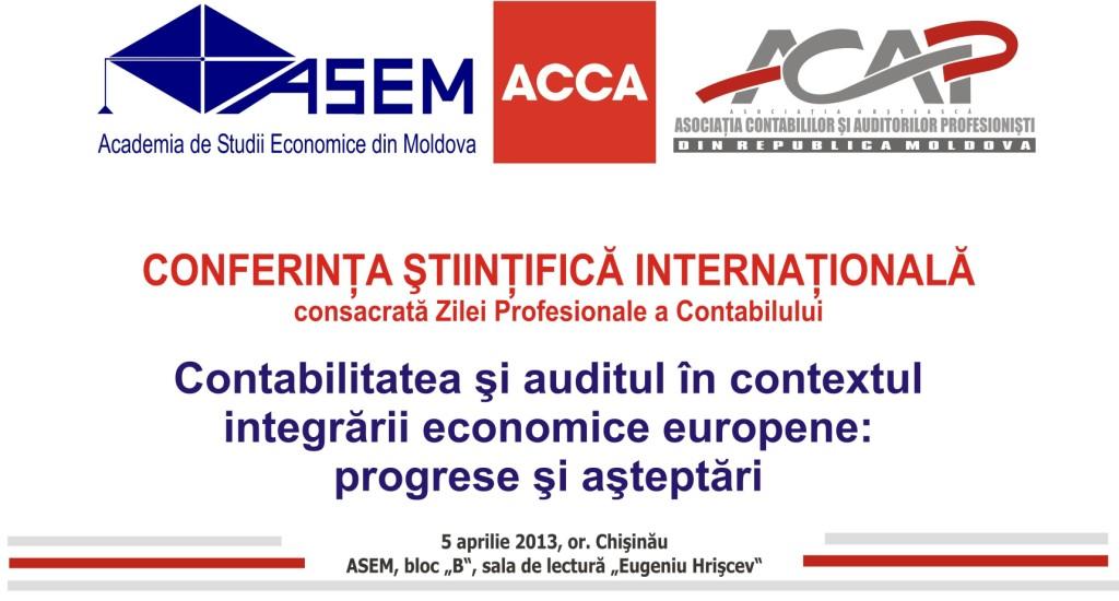 05 Aprilie 2013, ora 09:30, Chişinău, ASEM - Facultatea “Contabilitate” a Academiei de Studii Economice a Moldovei (ASEM) în parteneriat cu Asociaţia Contabililor şi Auditorilor Profesionişti din Republica Moldova (ACAP) şi Association of Chartered Certified Accountants (ACCA) a organizat Conferinţa Ştiinţifică Internaţională cu genericul: „Contabilitatea şi auditul în contextul integrării economice europene: progrese şi aşteptări”.