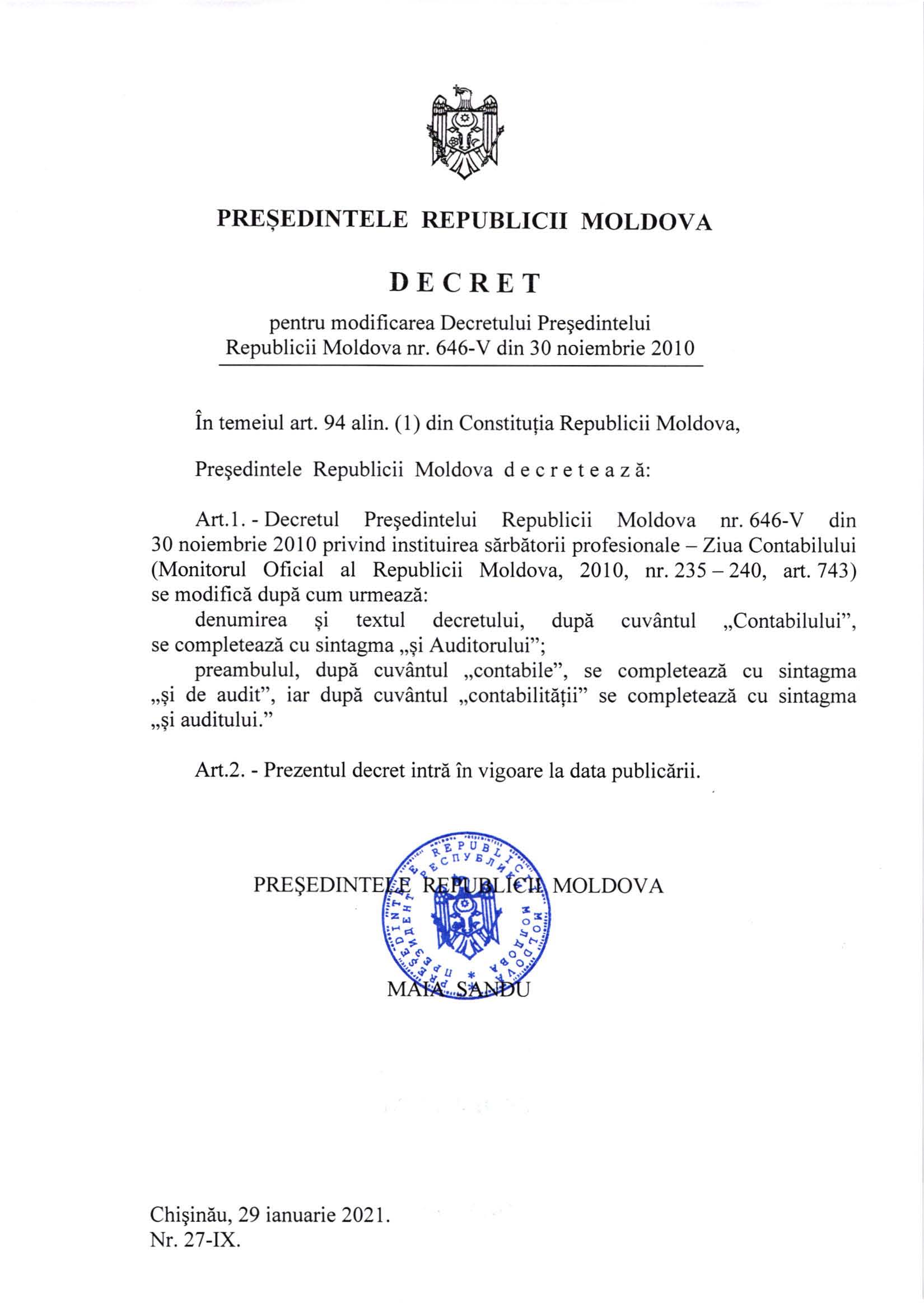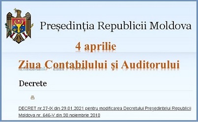 Pentru că auditorii au un rol cheie, la întărirea calității guvernanței corporative a entităților care sunt supuse auditului, făcându-le mai performante și ajutându-le să se integreze mai bine în economia Moldovei prin Decret prezidențial din 29.01.2021 a fost instituită Ziua Auditorului.