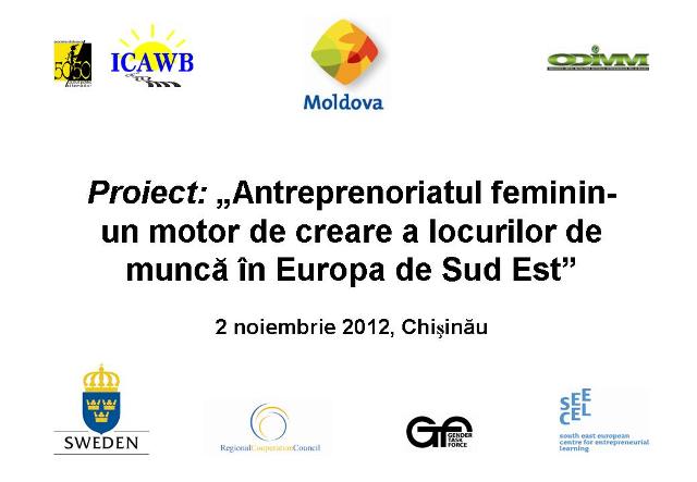 В проекте«Женское предпринимательство – двигатель создания рабочих мест в Юго-Восточной Европе», рассчитанном на период с 2012 по 2015 гг., участвуют Албания, Босния и Герцеговина, Хорватия, Косово, Македония, Молдова, Черногория, Сербия, Турция.