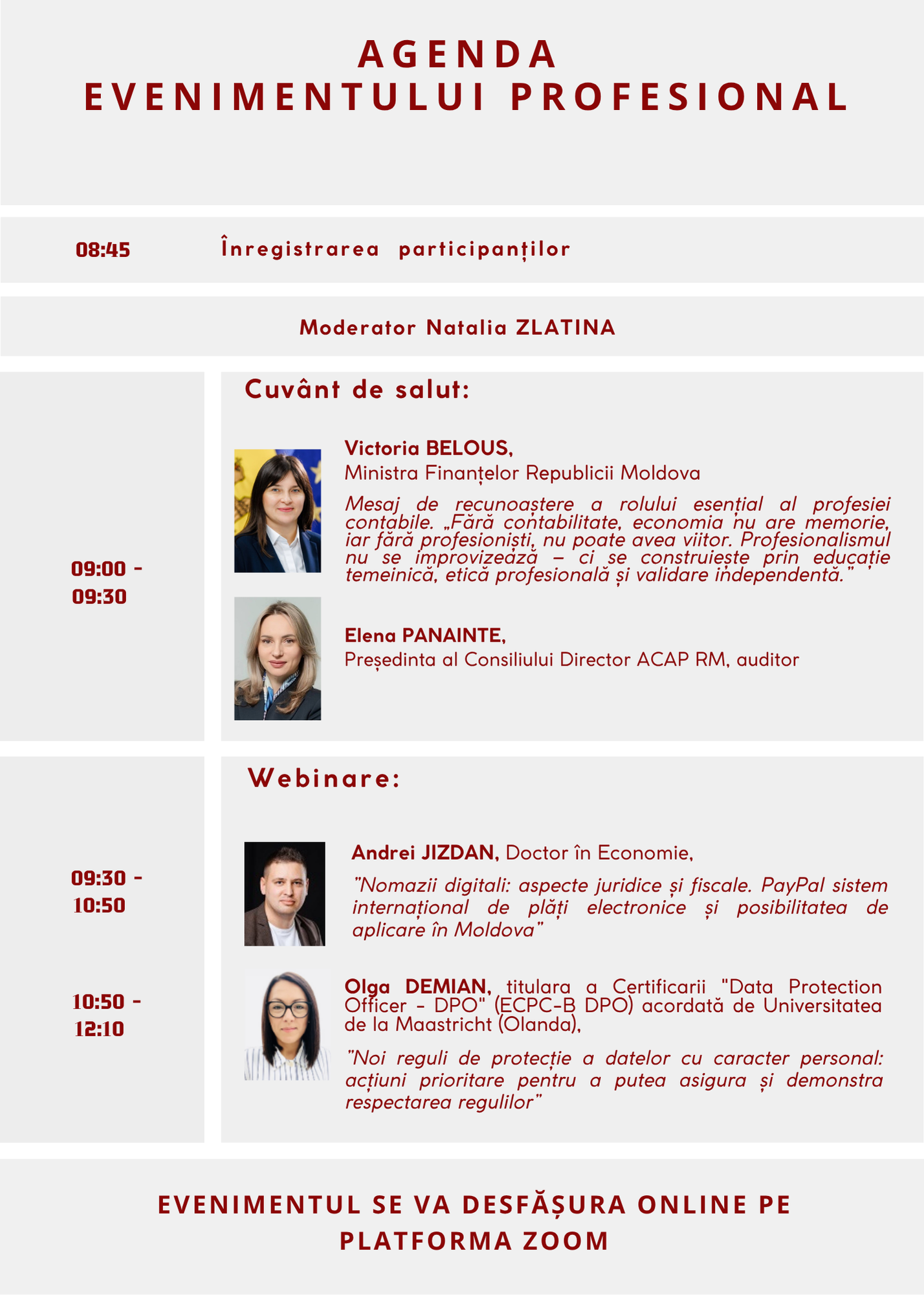 Мероприятие, проведённое в онлайн-формате на платформе ZOOM, прошло при участии Министра финансов, госпожи Виктории Белоус. В своём выступлении она выразила признательность за весомый вклад, который бухгалтерская и аудиторская профессия вносит в развитие экономики Республики Молдова и укрепление общественного доверия.